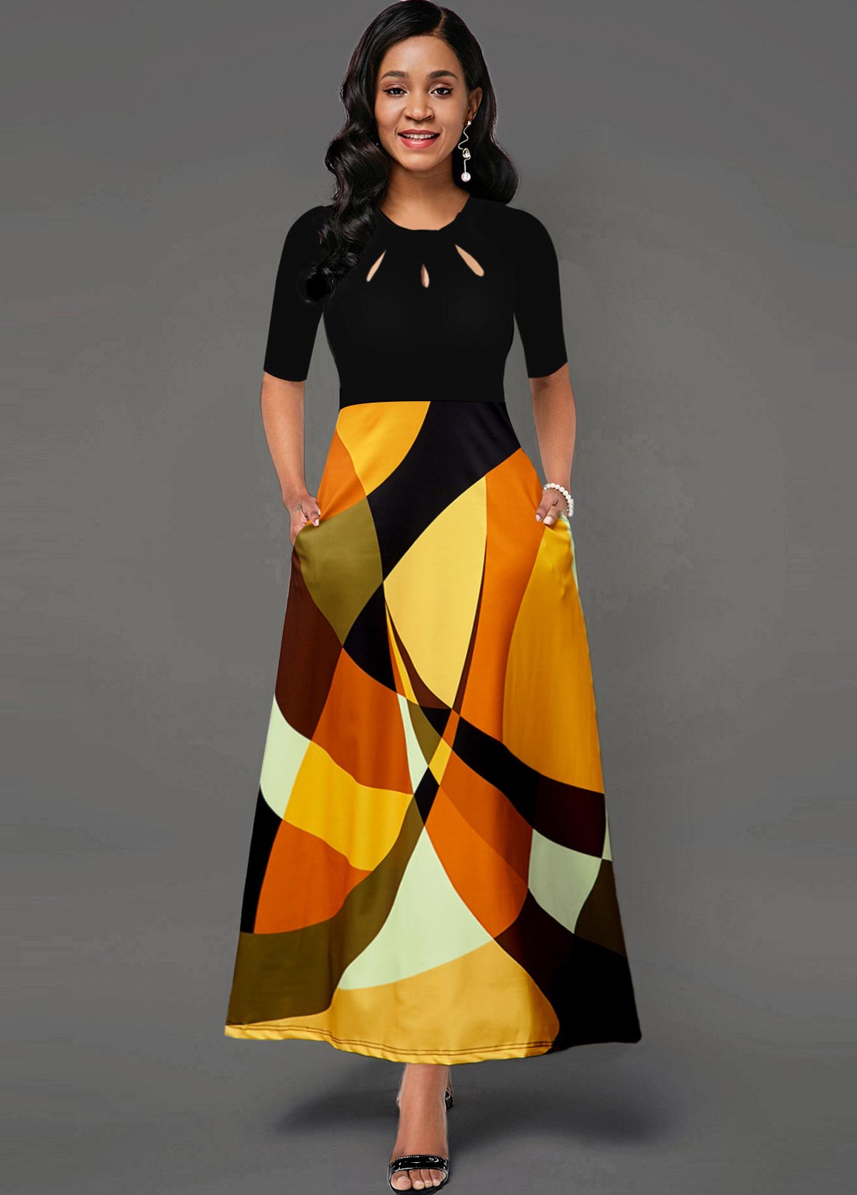 Rotita Side Pocket Cutout Neck Geometric Print Maxi Dress Rotita Com Usd 22 99
